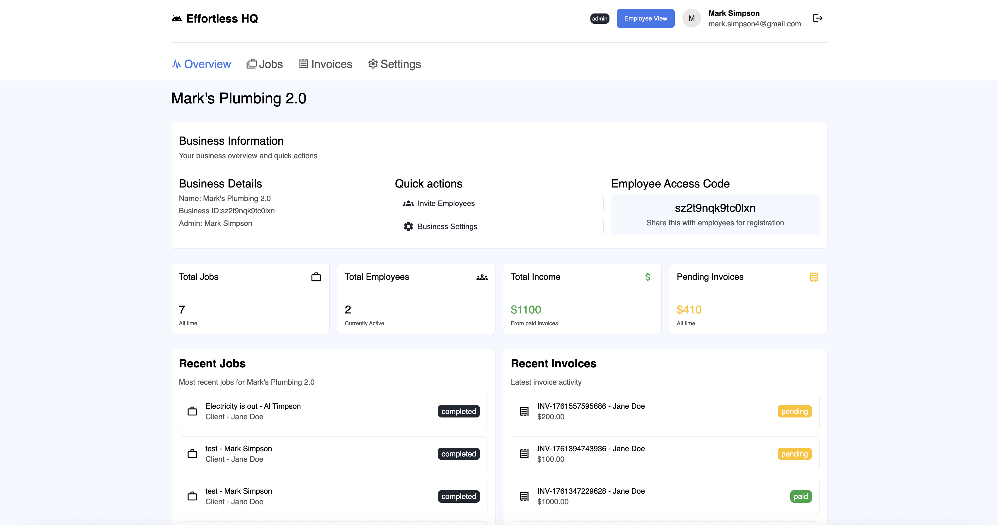 Small-business invoicing system with automated job → invoice → email workflows, employee accounts, dashboards, and PocketBase authentication.