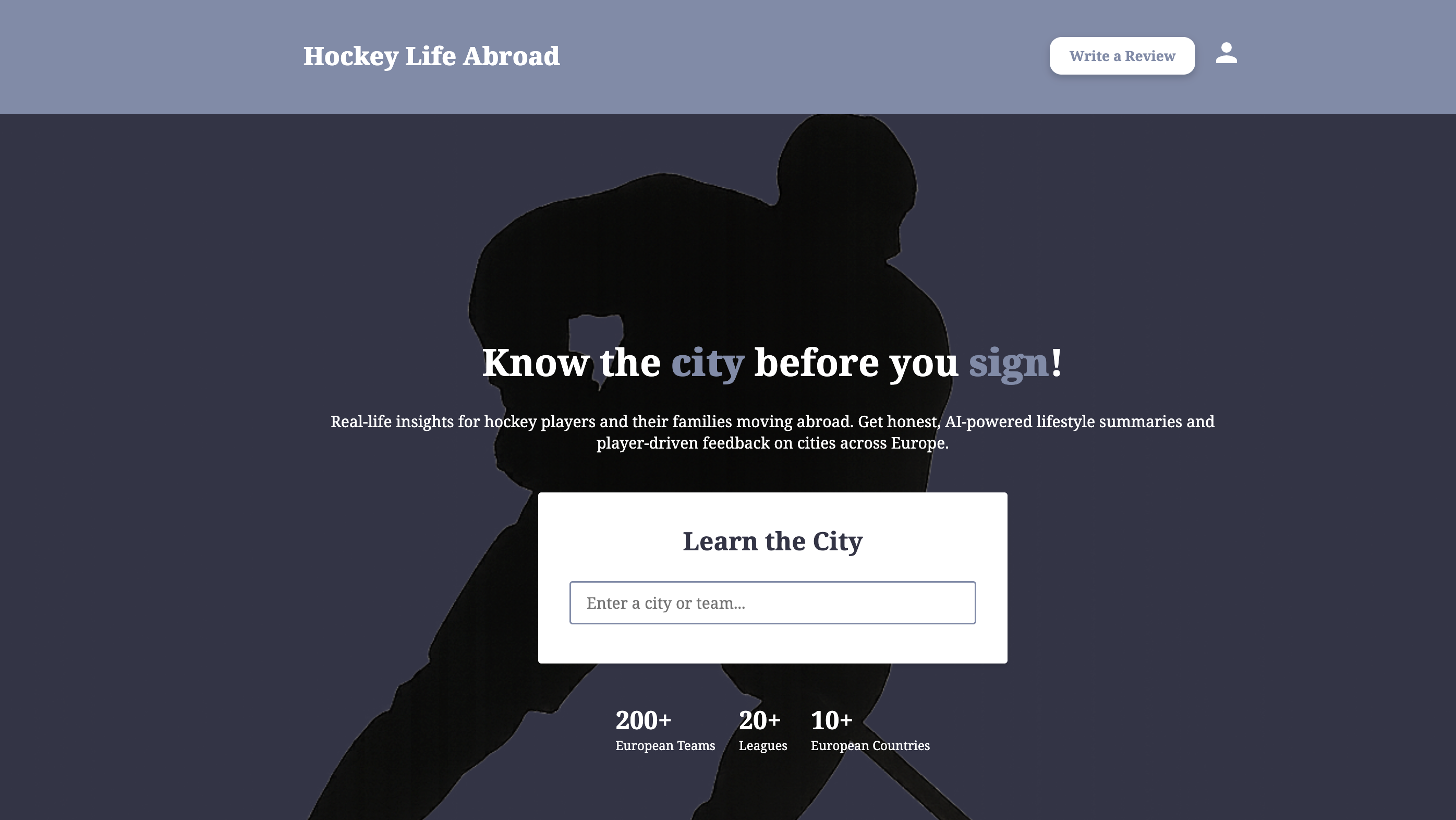 Full-stack platform helping hockey players research European cities, leagues, and teams before they move there. Includes travel tools, reviews, and user content features.