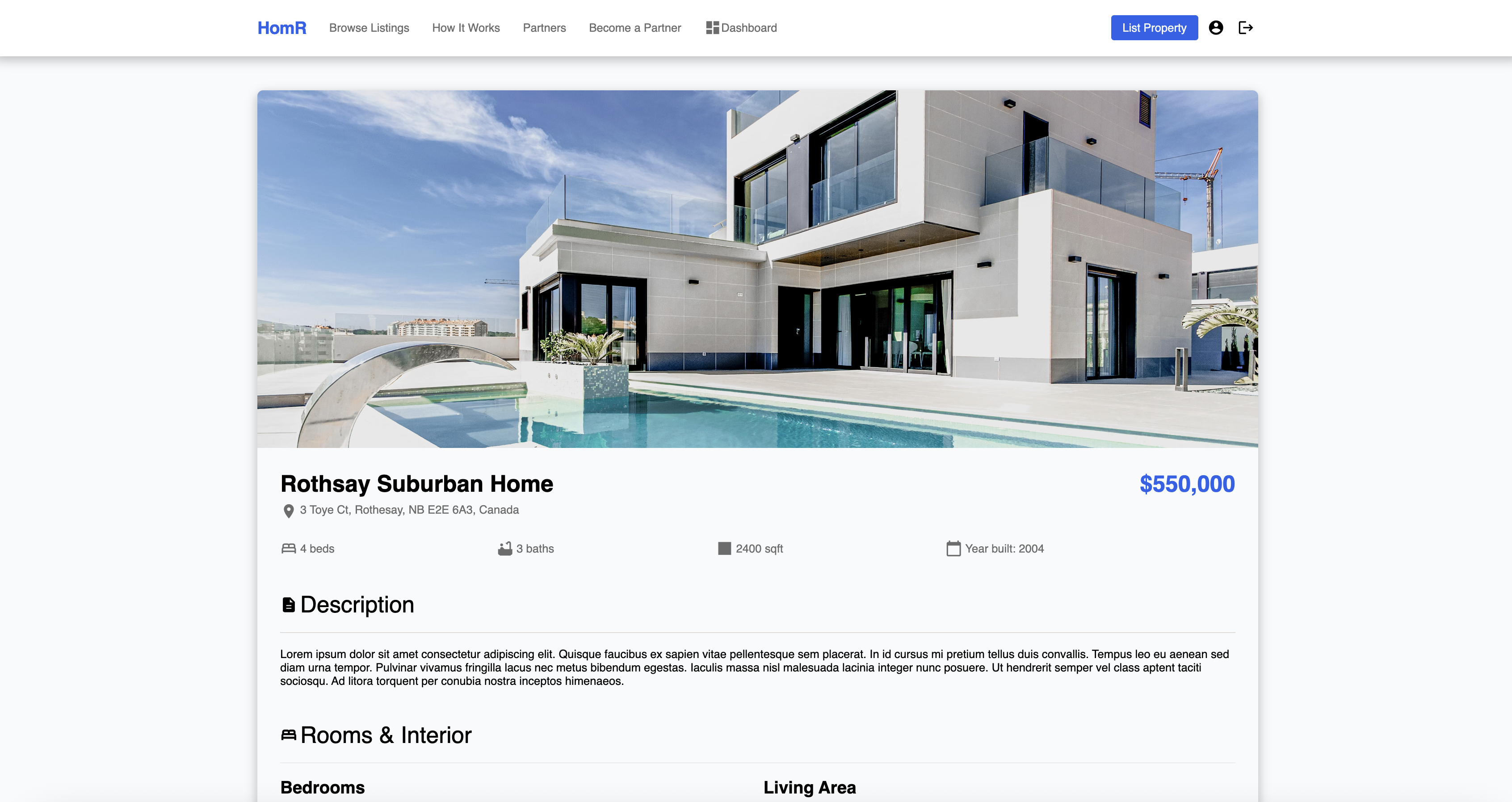 HomR is a full-stack real-estate platform allowing homeowners to list properties, receive offers, and connect with service partners such as lawyers and inspectors. It features listing management, negotiation workflows, and partner onboarding, built with PocketBase authentication and storage. The project demonstrates marketplace design, user roles, and automated operational workflows.